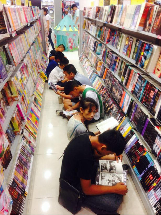 本屋の日本のマンガコーナーの前で座り読みに徹する子供たち笑